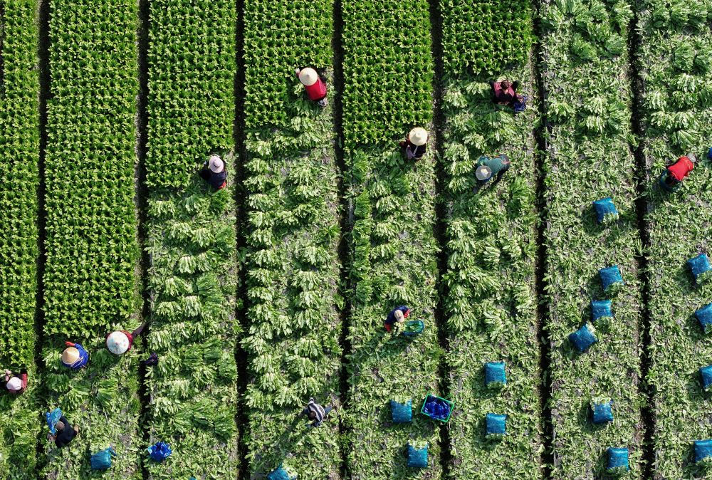 2026年2月24日,农民在四川彭州市九尺镇玉源社区的田地里采收油麦菜(无人机照片)。新华社发(罗国杨 摄)