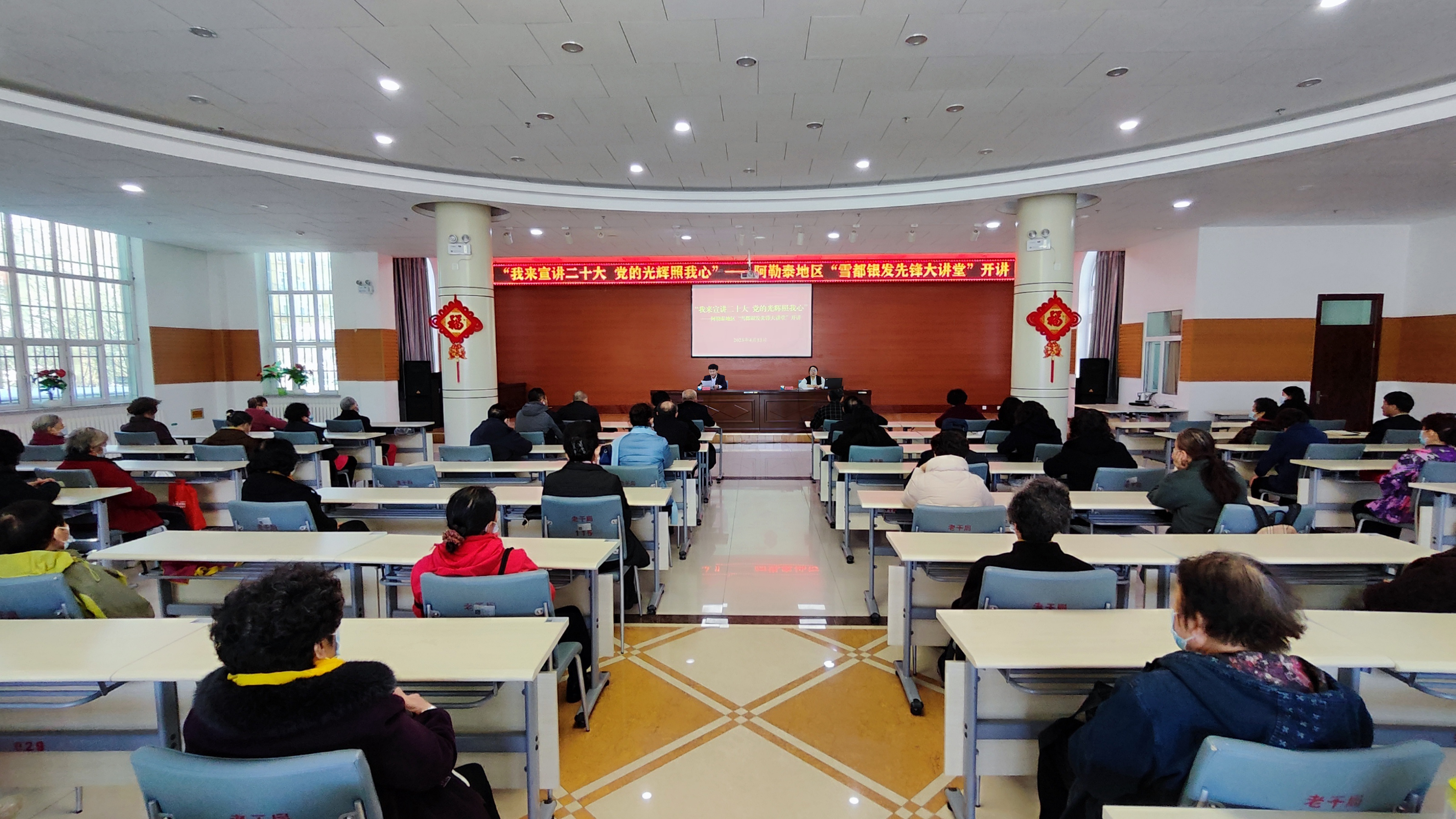 阿勒泰新闻网-阿勒泰地区融媒体中心(记者 董世菊)4月13日,地委老干部局“我来宣讲二十大 党的光辉照我心”地区“雪都银发先锋大讲堂”开讲,地委党校政治部副主任、高级讲师,离退休干部党支部宣传委员曹艳进行授课,地区各级离退休干部、地直部门(单位)离退休干部党支部书记、委员及地区老年大学部分学员现场聆听。