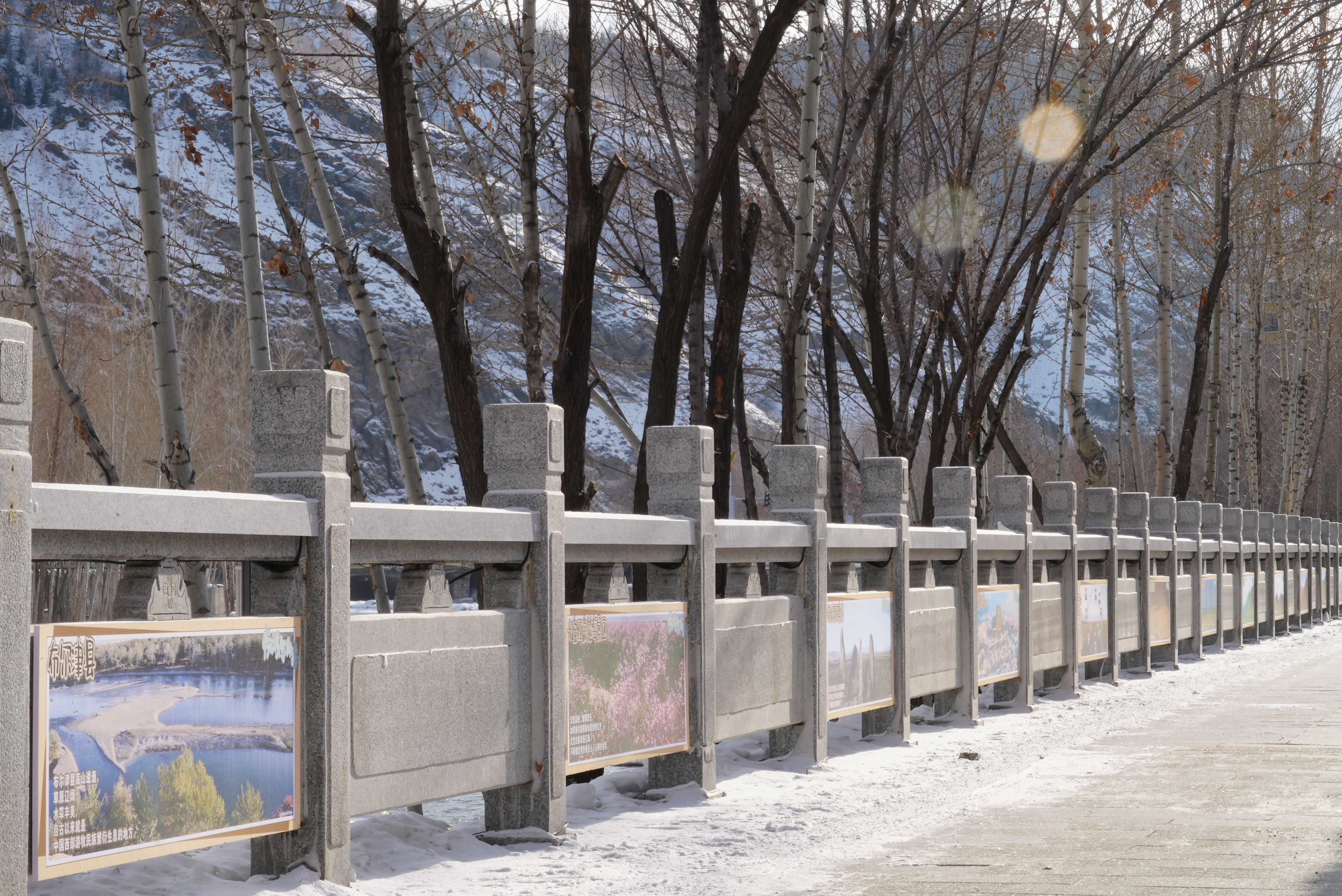 阿勒泰新闻网-阿勒泰地区融媒体中心 ( 记者 代维利 ) 12月10日,记者在阿勒泰市五百里风情街一侧的克兰河畔看到,这里布设了“畅游阿勒泰”展板,即使在冰天雪地的冬季,游客和市民也能一睹阿勒泰的四季美景。