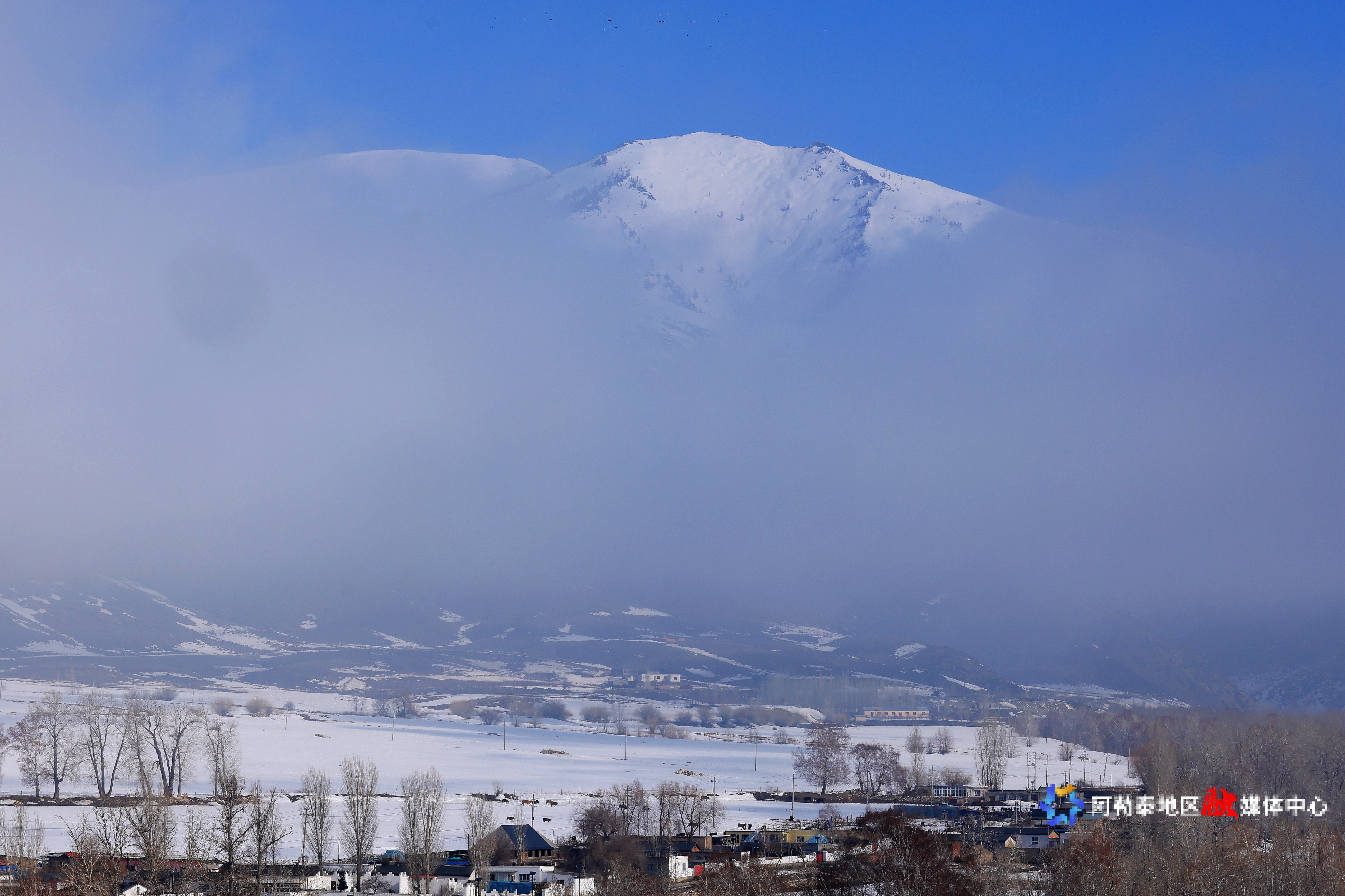 2025年3月24日,阿勒泰市克兰大峡谷出现云海景观,村庄、山脉一起构成了一幅美丽的山村画卷。记者 阿尔达克·拜斯汗 摄