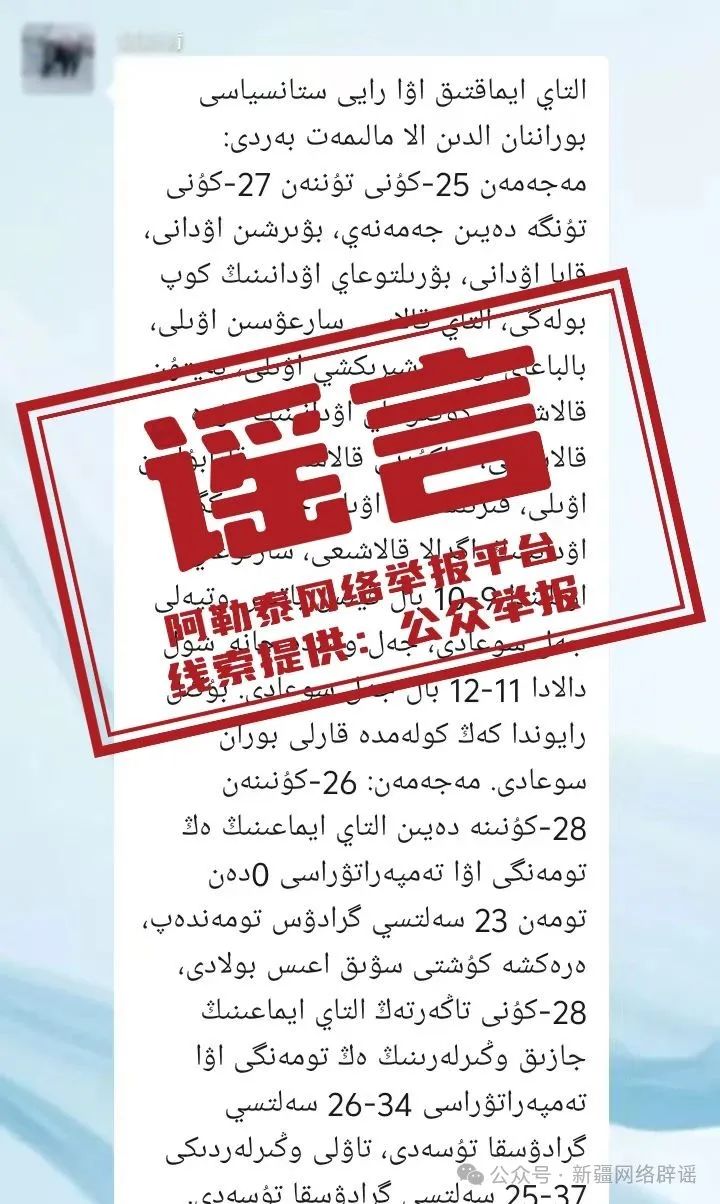 近期,有群众反映,多个微信群中传播一则民语类天气预报信息,称“阿勒泰地区气象台预计25日夜间至27日夜间,将出现大范围大风和强寒潮天气”。经气象部门核实,该信息系拼凑历史气象数据、虚构发布时间和预报内容,属不实信息。
