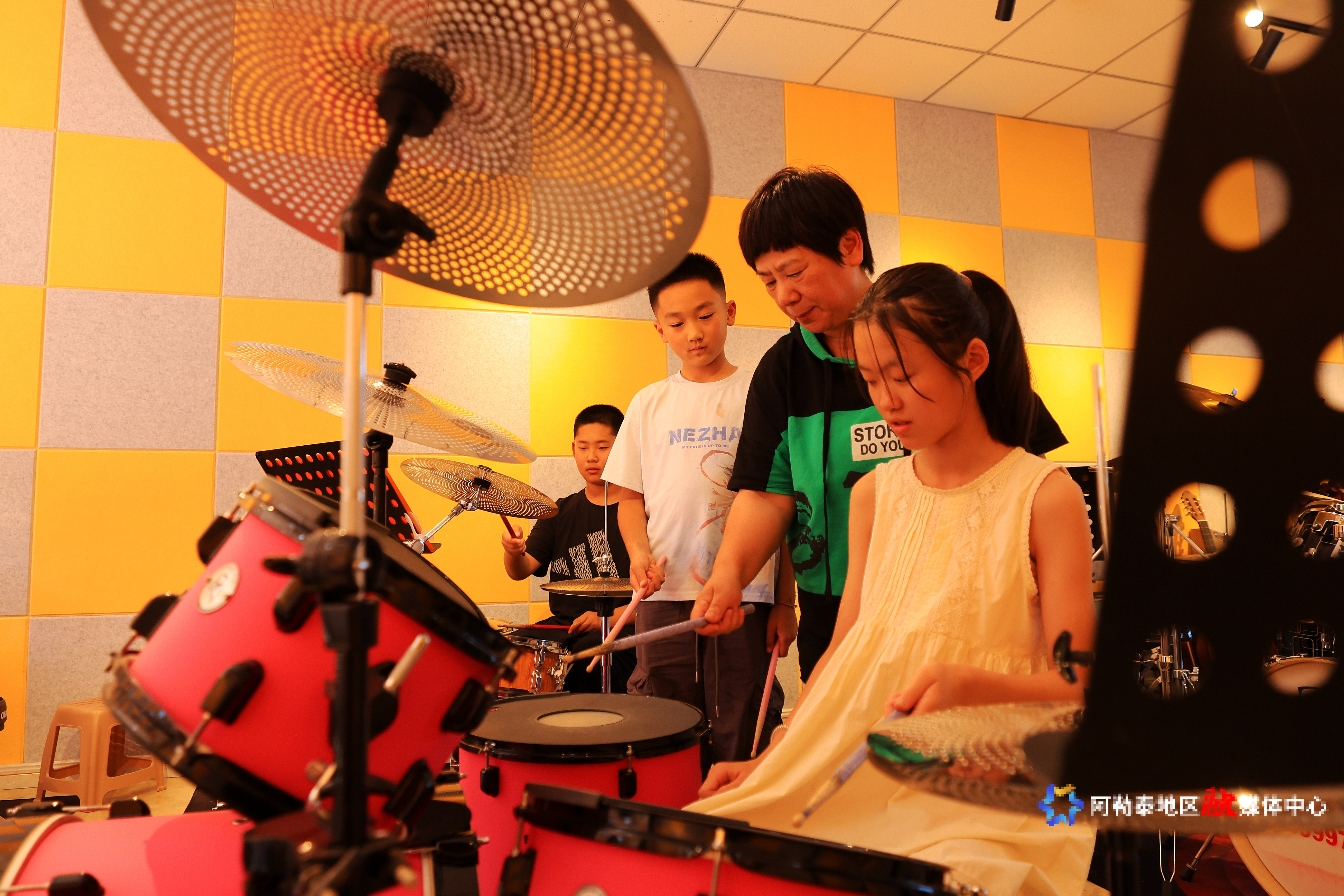 2025年7月10日,学生在练习架子鼓。记者 阿尔达克·拜斯汗 摄