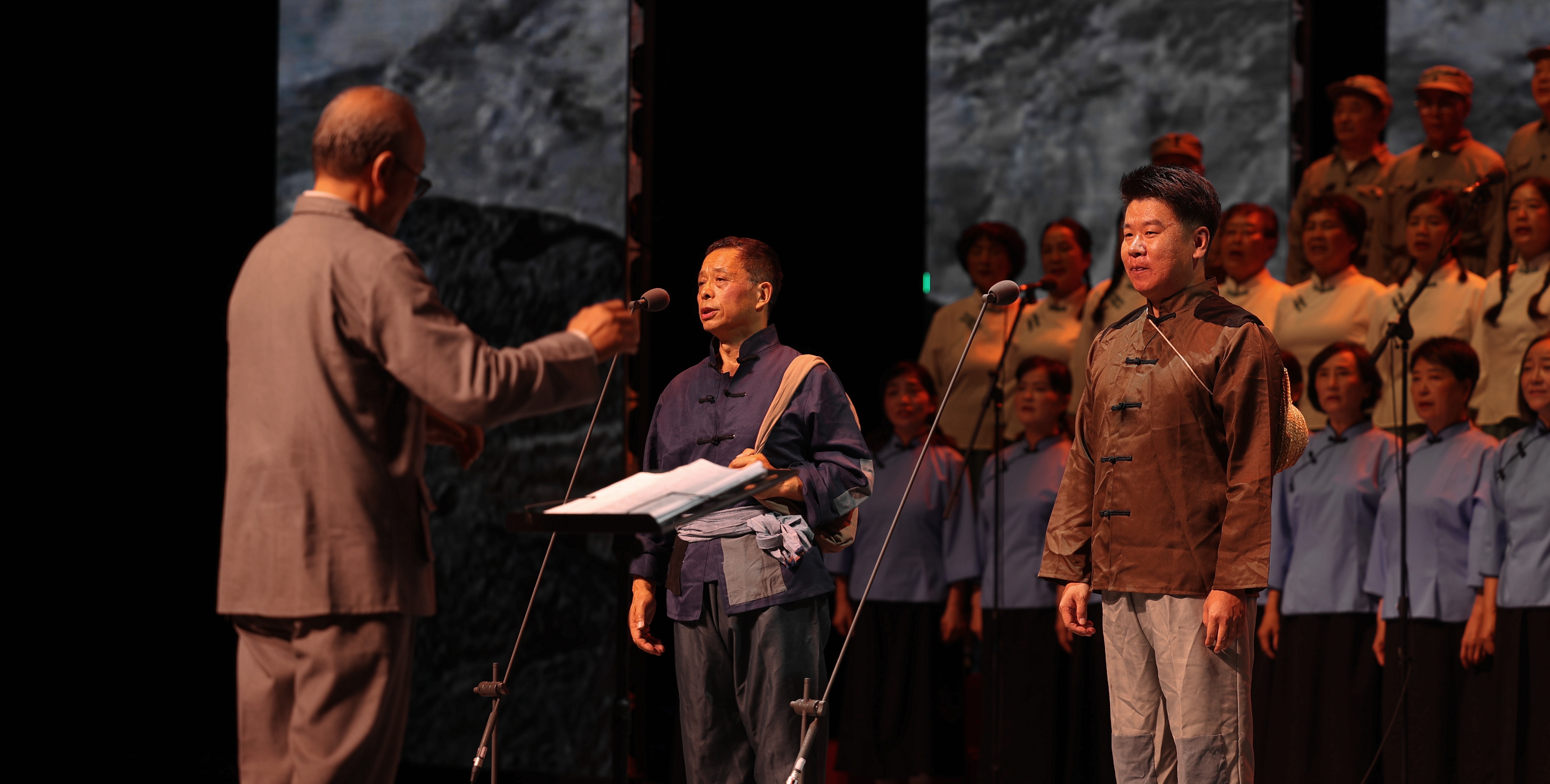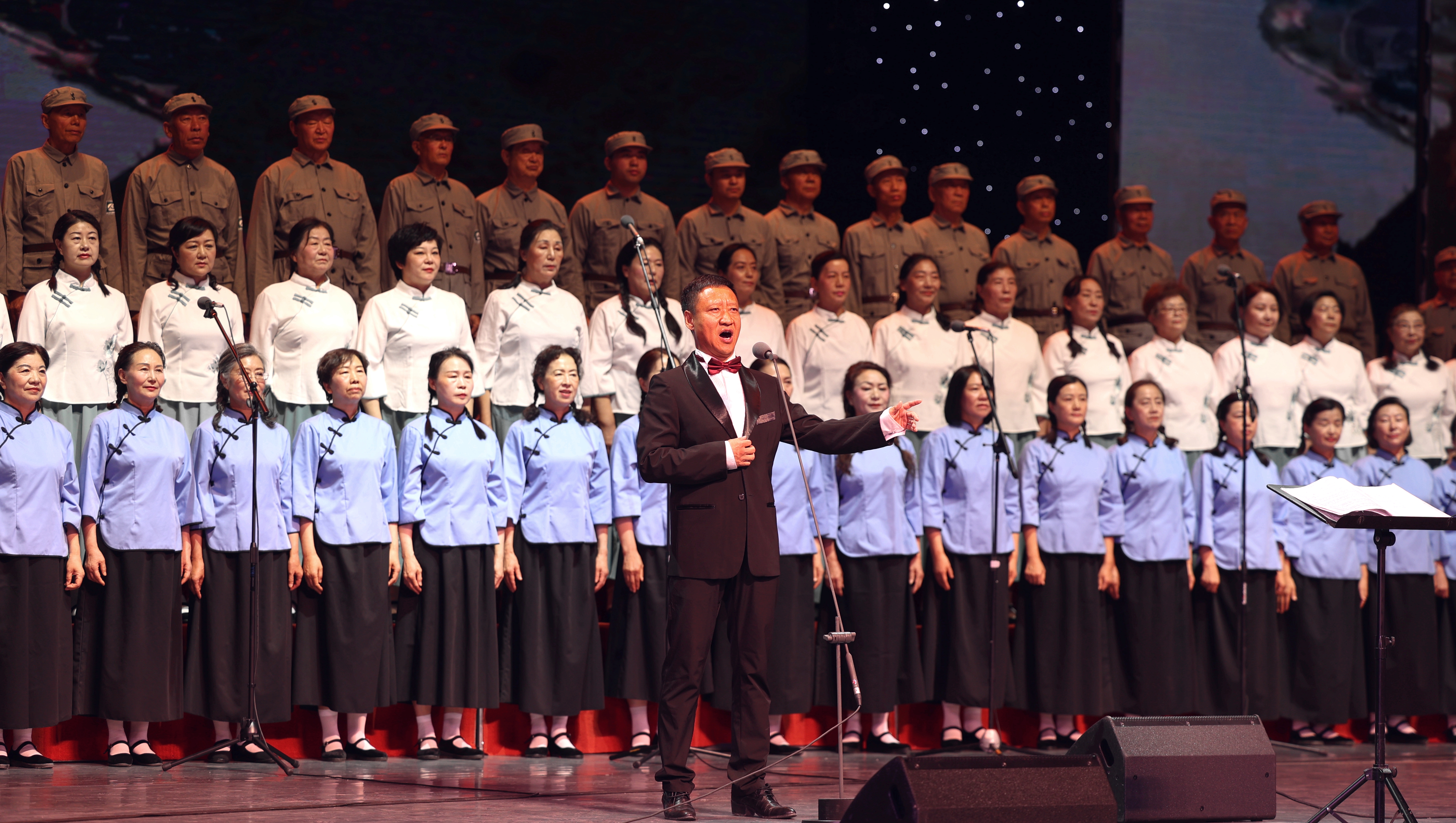 地区音乐家协会主席、地区音协合唱团指挥林勇刚表示:“这些旋律里既有先烈的热血,也有民族的脊梁,我们将这份力量传递给观众——记住历史,才懂今天的安宁多珍贵。”诗朗诵《黄河之水天上来》表演者孙磊动情地说:“历史的车轮滚滚向前,但80年后的今天,当我们再次回望那段烽火岁月,心中依然充满敬畏与感怀。历史的创伤永远不能遗忘,英勇抗战的精神永远不能褪色!”