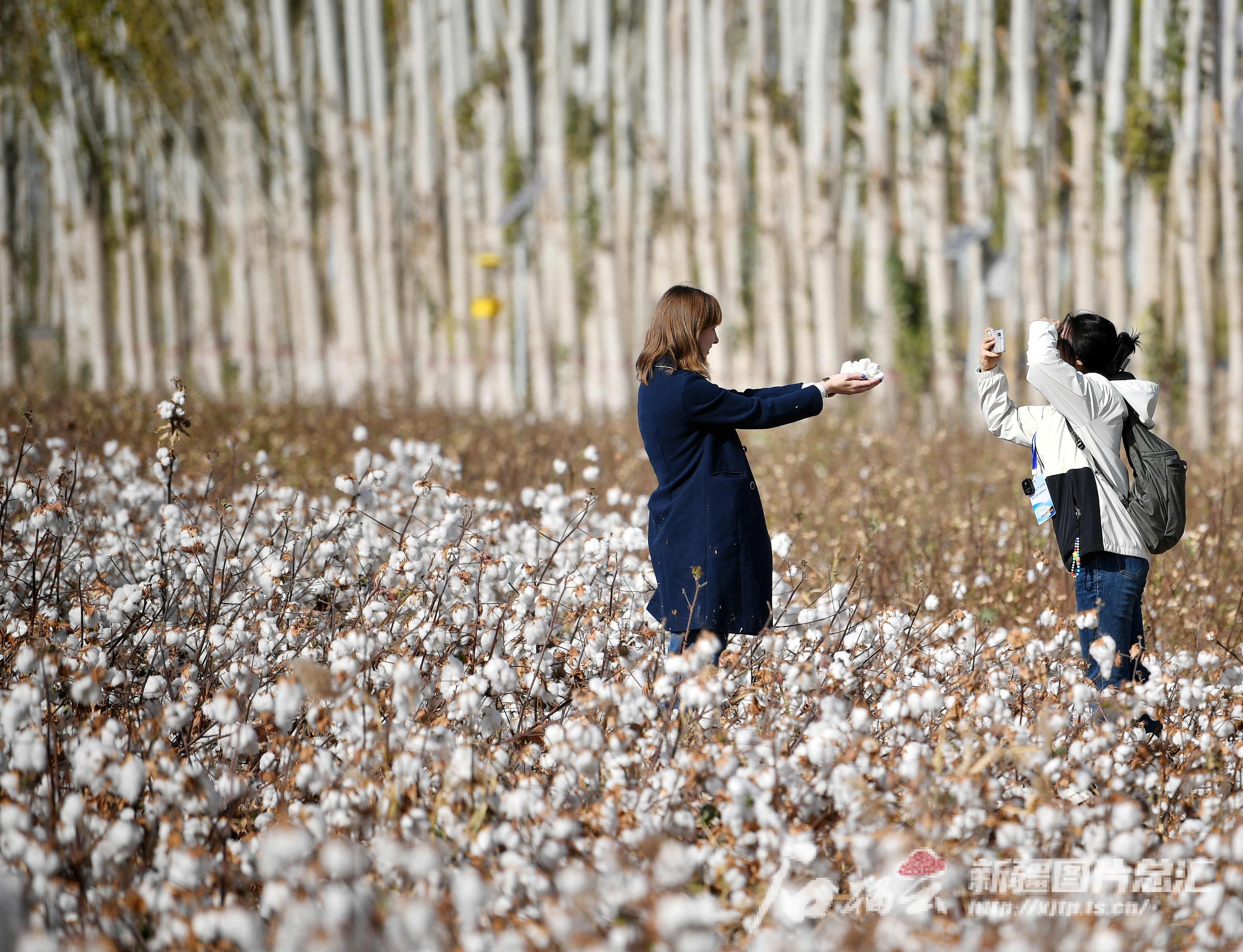 10月21日,中国外文局欧亚中心俄罗斯籍记者爱丽克斯·玻滋达耶娃(中)在采访棉农。