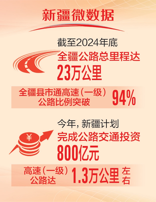 从简易土路,到高速公路通达所有地州市;从出门一脚泥,到硬化路修到家门口;从出行靠徒步、毛驴车,到抬脚就上车……70年来,波澜壮阔的新疆交通运输画卷渐次铺展于天山南北。截至2024年底,全疆公路总里程达23万公里,所有乡镇和具备条件的建制村通了硬化路和客车,为新疆经济腾飞奠定了坚实基础。今年,新疆计划完成公路交通投资800亿元,高速(一级)公路达1.3万公里左右、高速公路突破8000公里。