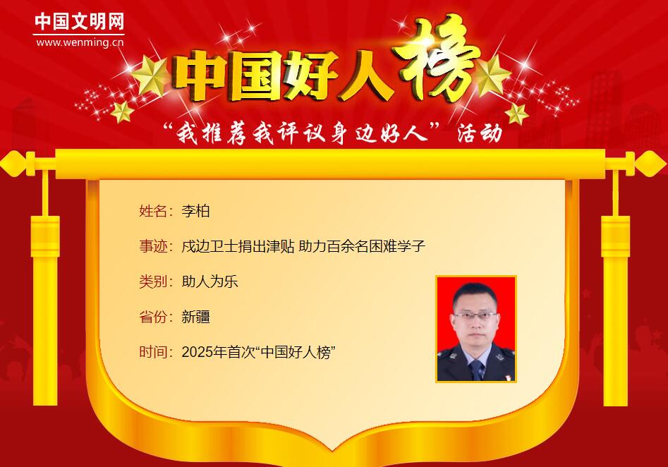 李柏,男,1990年11月生,中共党员,新疆出入境边防检查总站博州边境管理支队温泉边境管理大队哈日布呼边境派出所三级警长。从警以来,李柏始终怀揣赤子之心,一边卫国戍边,一边投身公益助学。他深知教育对农村孩子的重要性,从2014年拿到部队第一笔津贴起,李柏通过捐款捐物、结对资助等方式,累计帮扶困难学子100余人。李柏的善举也感染了身边同事,先后有多名民警加入“红十月爱心志愿者服务队”,开展公益活动1300余次,帮助困难儿童、独居老人等群体。