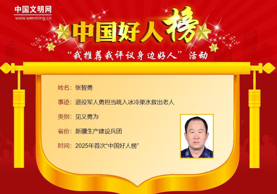 张智勇,男,1974年6月生,新疆生产建设兵团第十三师新星市红星一场居民。2024年7月7日早上,张智勇在店门口补胎时,听到“扑通”一声,察觉可能是有人落水,他立刻跑到红星渠边。只见一位老人在水中挣扎,水流湍急,情况危急。张智勇毫不犹豫地跳入冰冷的渠中,在好心人的帮助下,将老人成功救上岸,自己却因救人受伤。