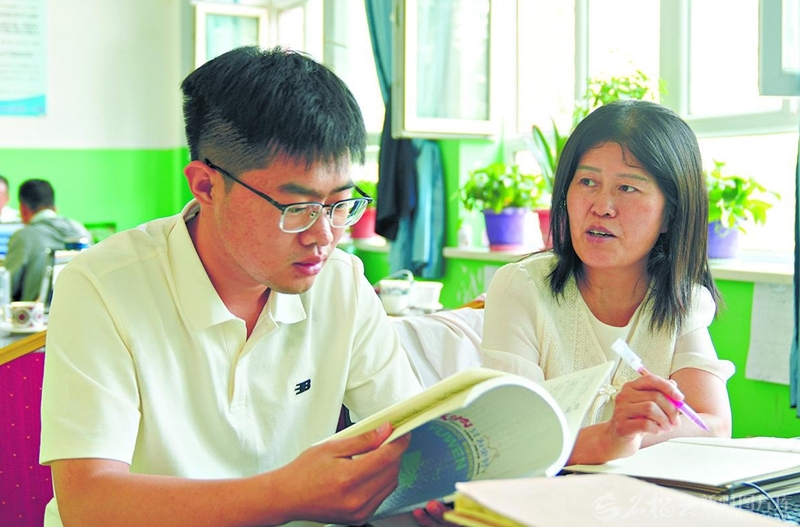 9月23日,河北保定学院西部支教毕业生李桂枝(右)在给2024年来到且末县的“师弟”翟少鹏传授教学心得。苏鑫摄