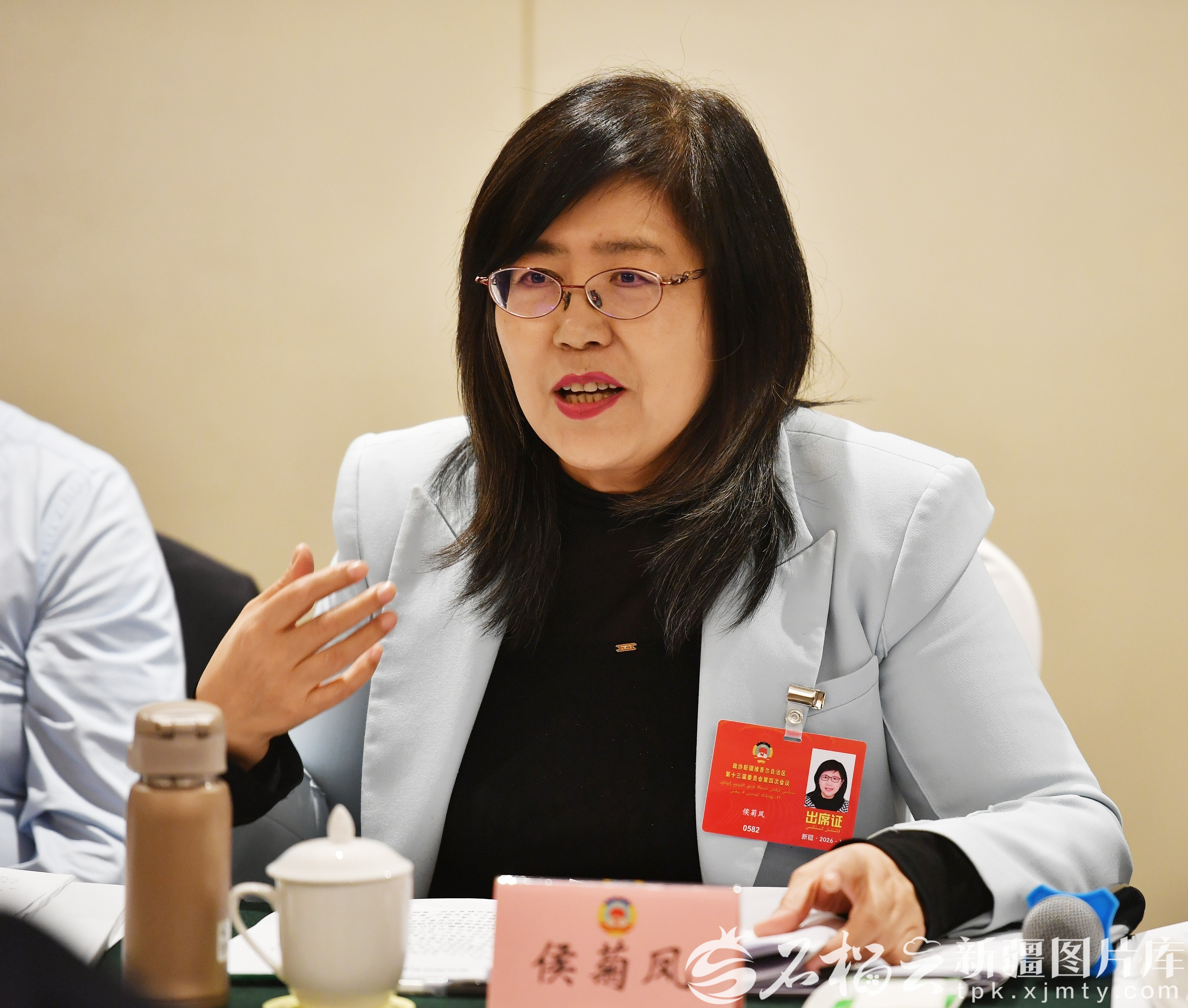 1月27日,社会科学界委员分组讨论政府工作报告、自治区“十五五”规划纲要草案、计划草案报告和预算草案报告时,侯菊凤委员围绕加快构建哲学社科的自主知识体系等内容发言。石榴云/新疆日报记者 邹懿摄